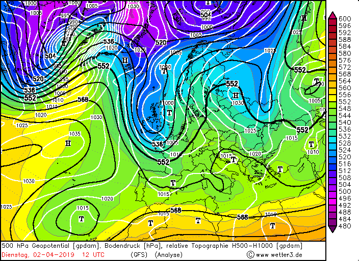 500 hPa Geopotential, soil pressure and 500-1000 hPa ReTop from 02 April to 05 April: