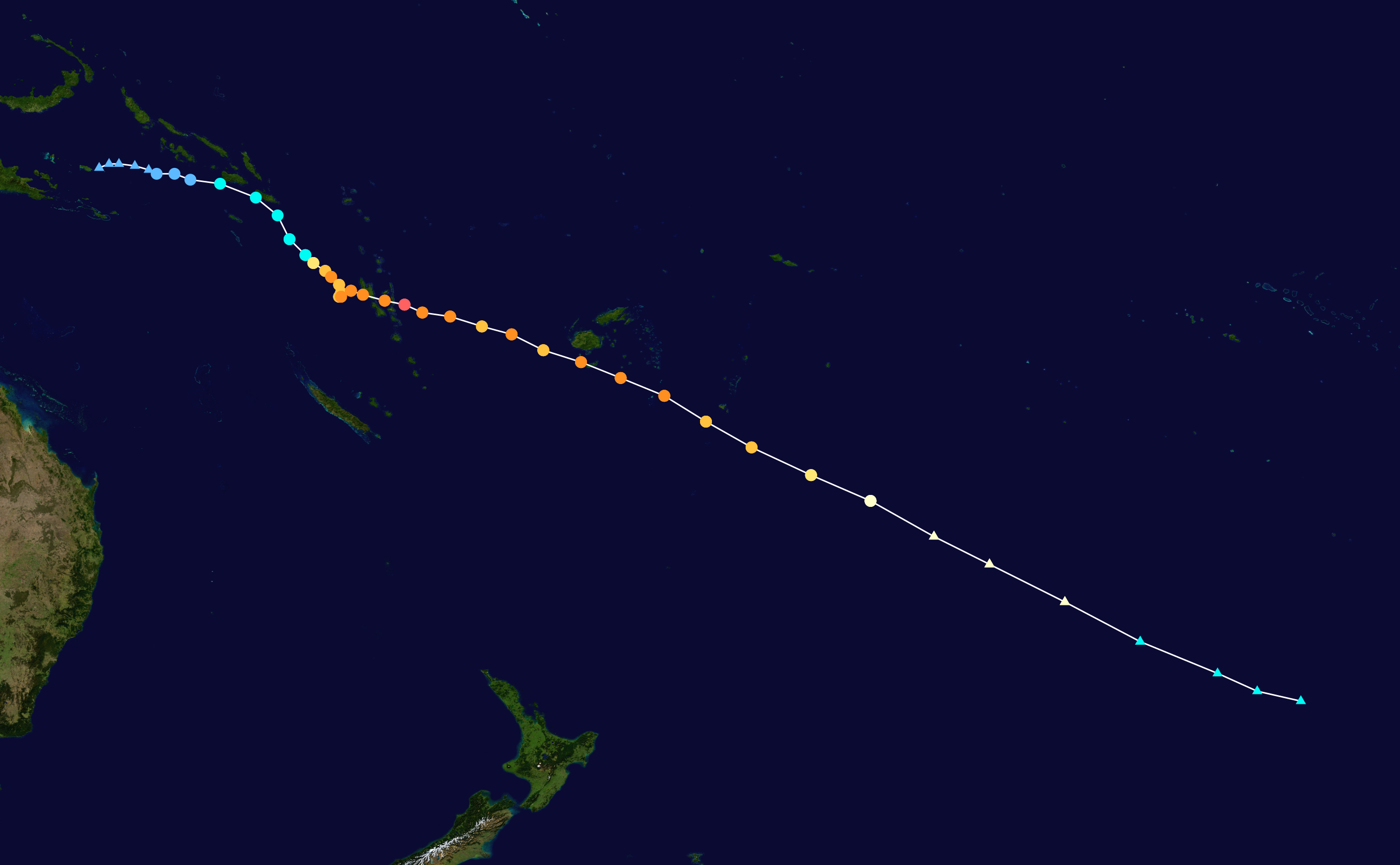 Cyclone HAROLD reached Category 5 intensity two times and penetrated the Solomon Islands, Vanuatu, the Fiji Islands and Tonga.