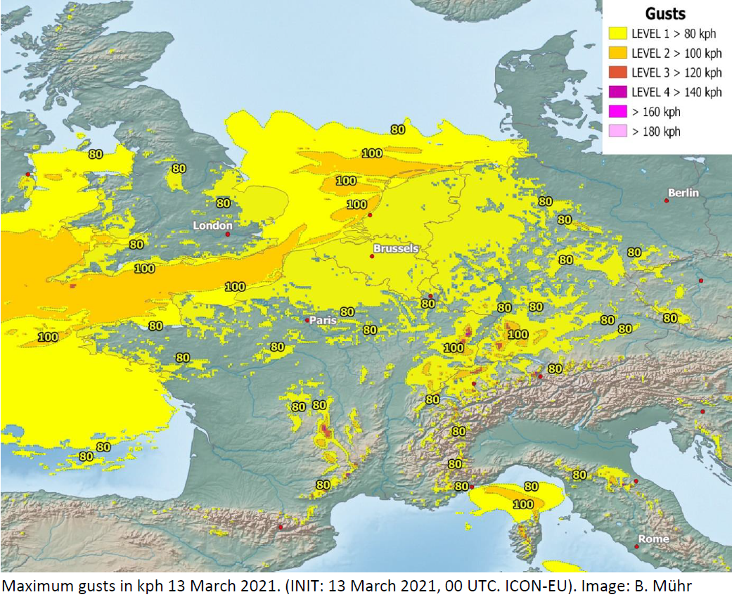 over several days. Gusts up to 130 kph occurred at multiple locations across Europe. The peak in Germany was