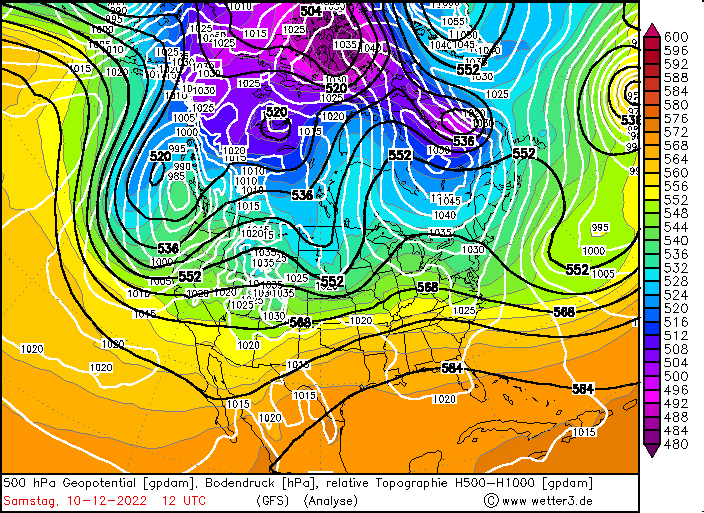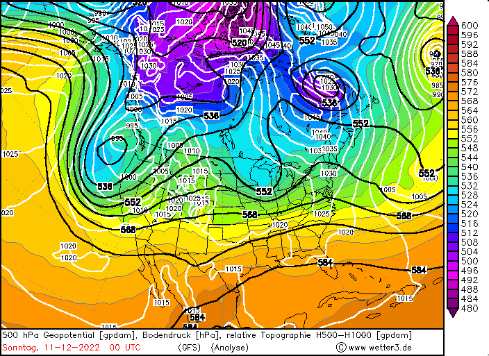 500hPa Geopotential and sea level pressure North America , 08.12.2022 12 UTC - 12.12.2022 00 UTC, source: