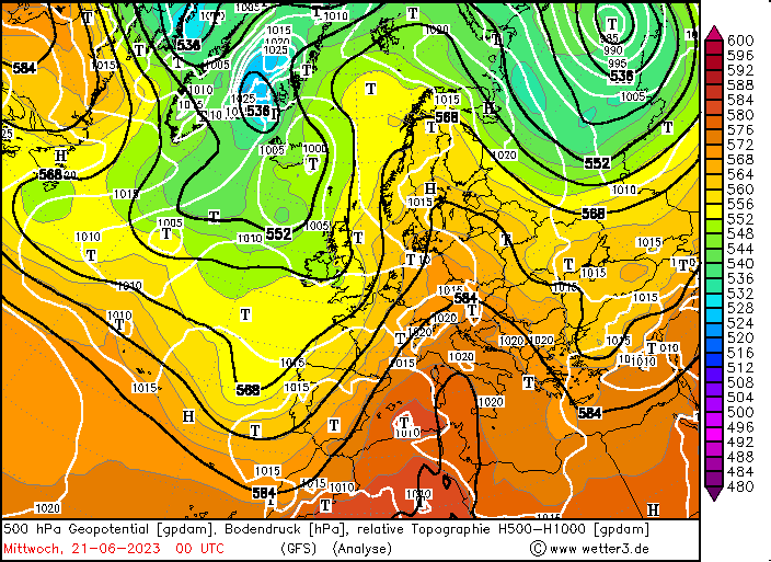 On June 20, 2023, a distinct secondary trough developed over the Iberian Peninsula moving northeastwards across Western Europe. Nearing Central Europe, a complex synoptic situation developed, with a shallow surface low developing over Germany on June 22, 2023, with the core pressure reaching only slightly less than 1010 hPa. Nevertheless, this surface low further increased the advection of moist and very warm air masses into Germany, with the 850 hPa temperatures reaching 25 °C in the Alpine foothills. Due to the pressure difference across the Alps, a strong Föhn effect set in along the northern side of the Alps, leading to extreme heat in Föhn valley in the Alps. The temperatures reached 35,7 °C in Reit im Winkel, BY at an altitude of 685 m above sea level, which is only 0,4 K below the temperature record at the station and beating the previous June record by 1 K. At an non-DWD station at Lenggries in Bavaria temperatures of up to 38,4 °C were measured at a staggering 730 m above sea level. Besides the Alps, much of Southern Germany was experiencing sweltering heat from June 20 through June 22, 2023, with the heat stress being exacerbated by unusual high dewpoints with dewpoint temperatures close to the 20 °C-mark.