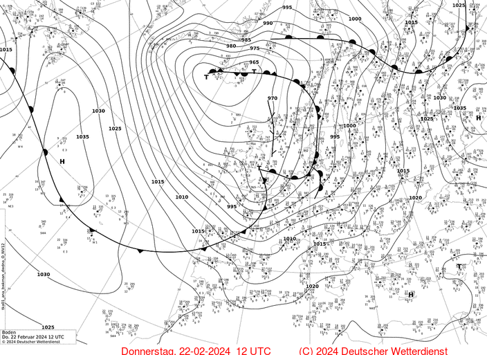 In the final decade of February 2024 which proved to be exceptionally warm in Central Europe, a strong steering low moved over the Northern Atlantic between the British Isles and Iceland. On February 22, 2024, a shallow surface low developed at the southern tip of said steering low off the coast of Ireland. Throughout the day, the low moved quickly eastwards across the English Channel over the North Sea. Within a 24 h period, the core pressure of the system dropped by 35 hPa, easily fulfilling the threshold for rapid cyclogenesis.