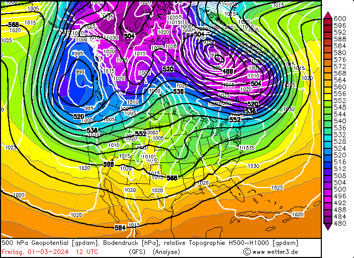 500 hPa Geopotential and sea surface pressure over North America, 29.02.2024 12 UTC - 04.03.2024 00 UTC, source: