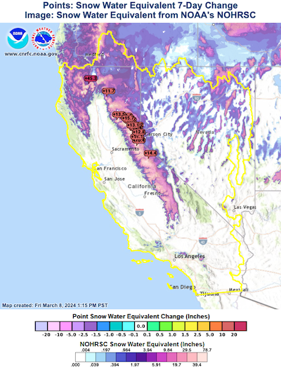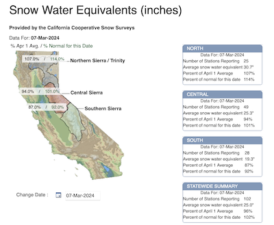 Snowpack of the Sierra Nevada measured by the snow water equivalent, 07.03.2024, source: