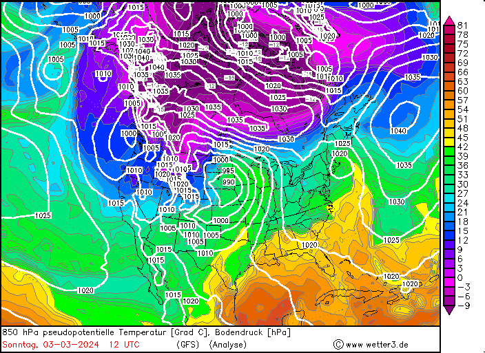 850 hPa pseudo-potential temperature and sea surface pressure over North America, 29.02.2024 12 UTC - 04.03.2024 00 UTC, source: