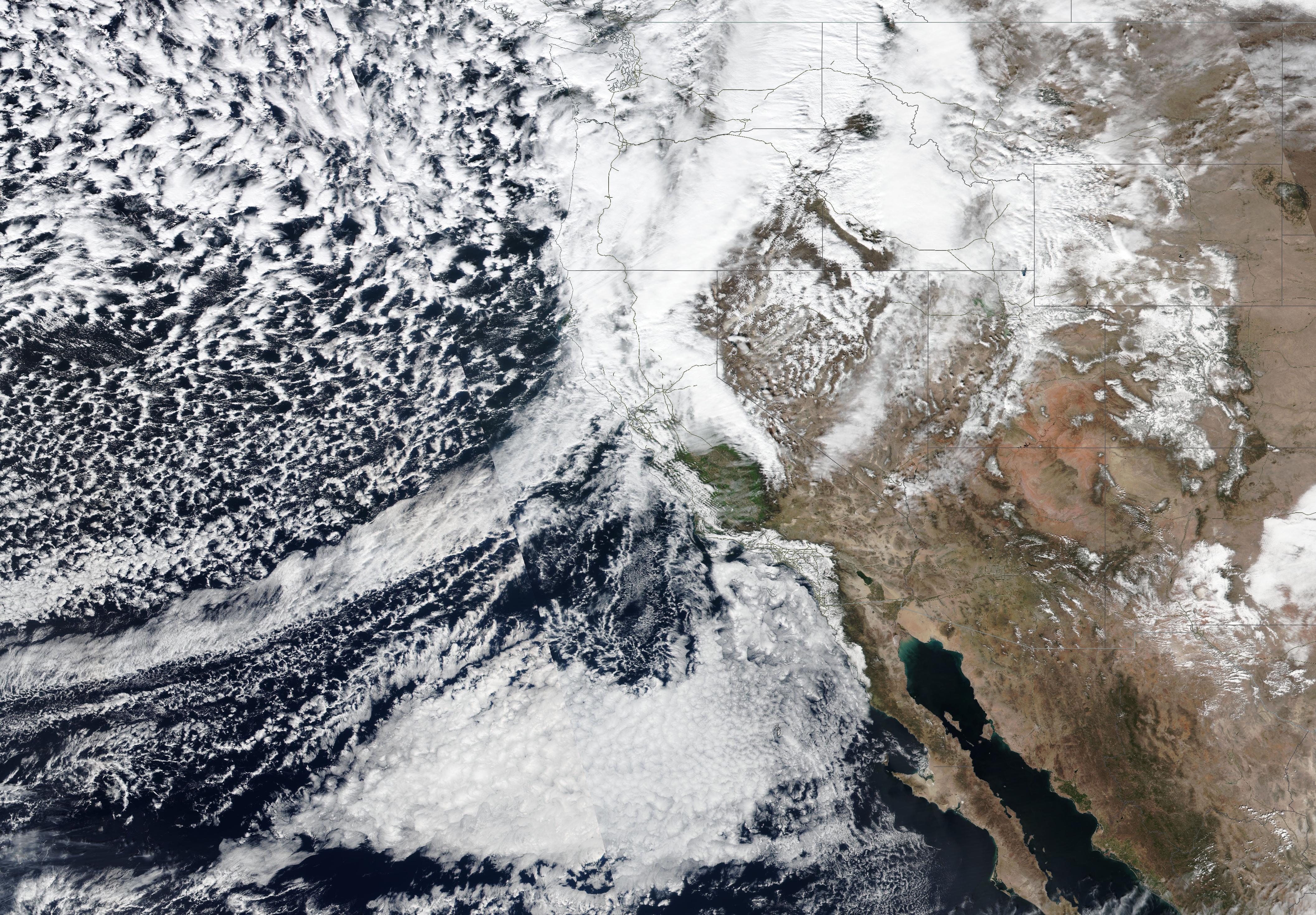 Since late January, multiple storm systems brought abundant snowfall to the Sierra Nevada, bringing the snowpack close to the season-up-to-date average. By late February, a strong outbreak of cold air masses from Northeastern Siberia led to the development of a strong trough over the Pacific Ocean off the coast of North America. The trough moved slowly eastwards over North America, advecting at the southern flank of the trough very moist air masses from the subtropical Pacific Ocean towards California.
