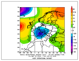 500 hPa geopotential mean (left) and anomaly (middle) and average meridional wind (right) over Europe, 30.05.2024 - 02.06.2024, source: