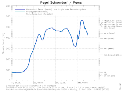 River level of the Rhine River at Maxau (upper left), 02.06.2024 - 05.06.2024, source: