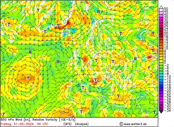 500 hPa geopotential, 1000 hPa to 500 hPa thickness, and sea-surface pressure (upper row), 850 hPa wind and relative vorticity (middle row), and 500 hPa geopotential and vertical velocity (lower row) over Europe, 31.05.2024 00 UTC - 03.06.2024 00 UTC, source: