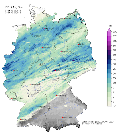 On June 19, 2024, no convective activity was observed over Germany. In the central part of Germany, continuous precipitation was observed with daily precipitation totals of less than 10 mm.