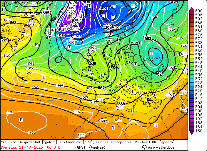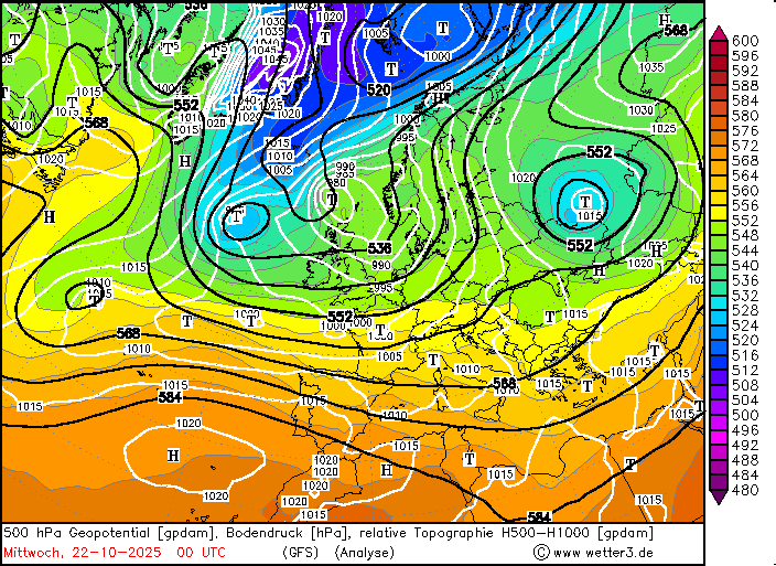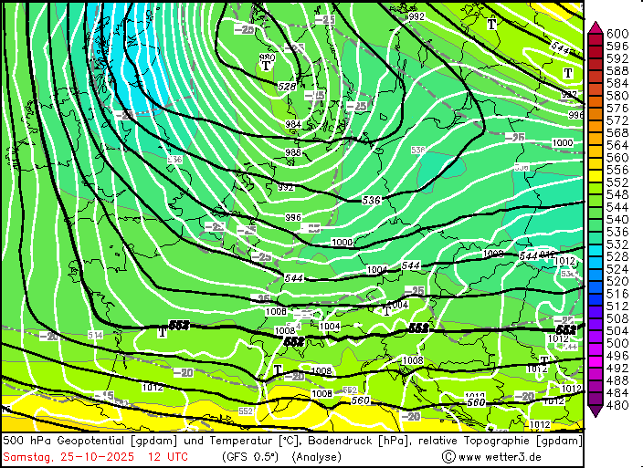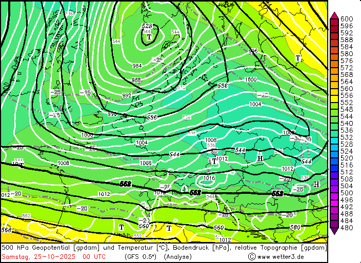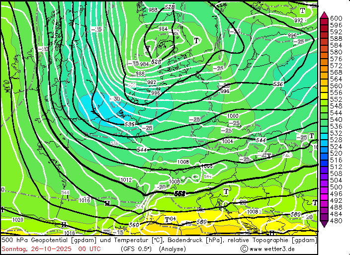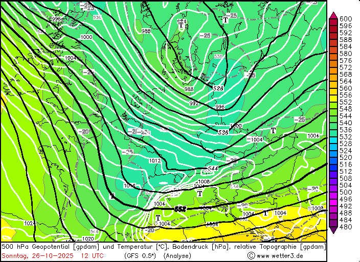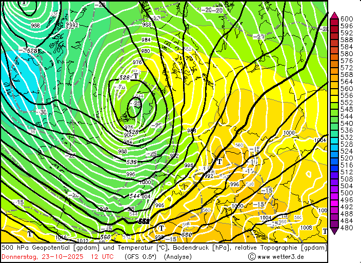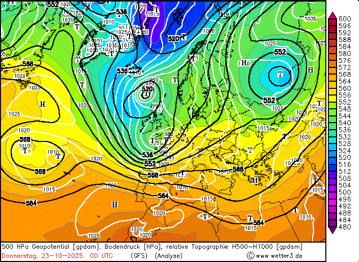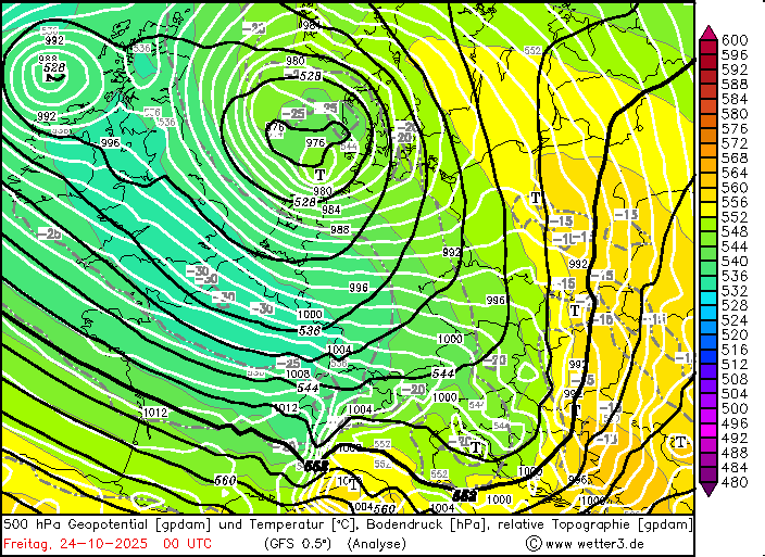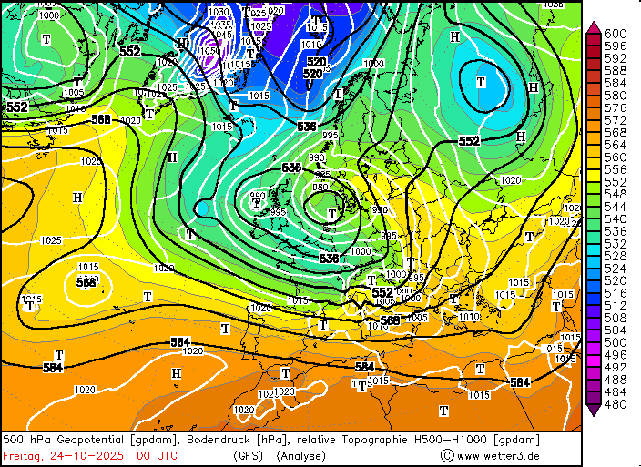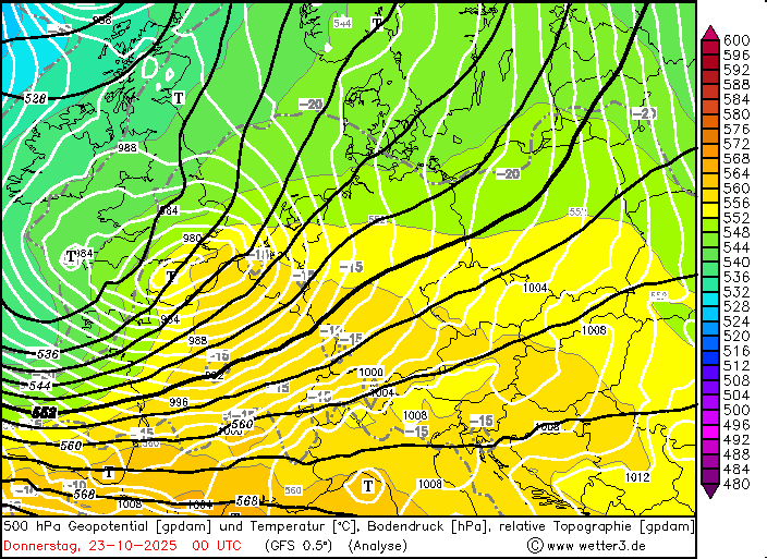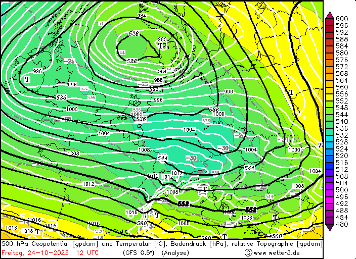 Development of the 500 hPa geopotential, 1000 hPa to 500 hPa thickness, and sea-surface pressure over Central Europe, 23.10.2025 00 UTC - 26.10.2025 12 UTC, source: