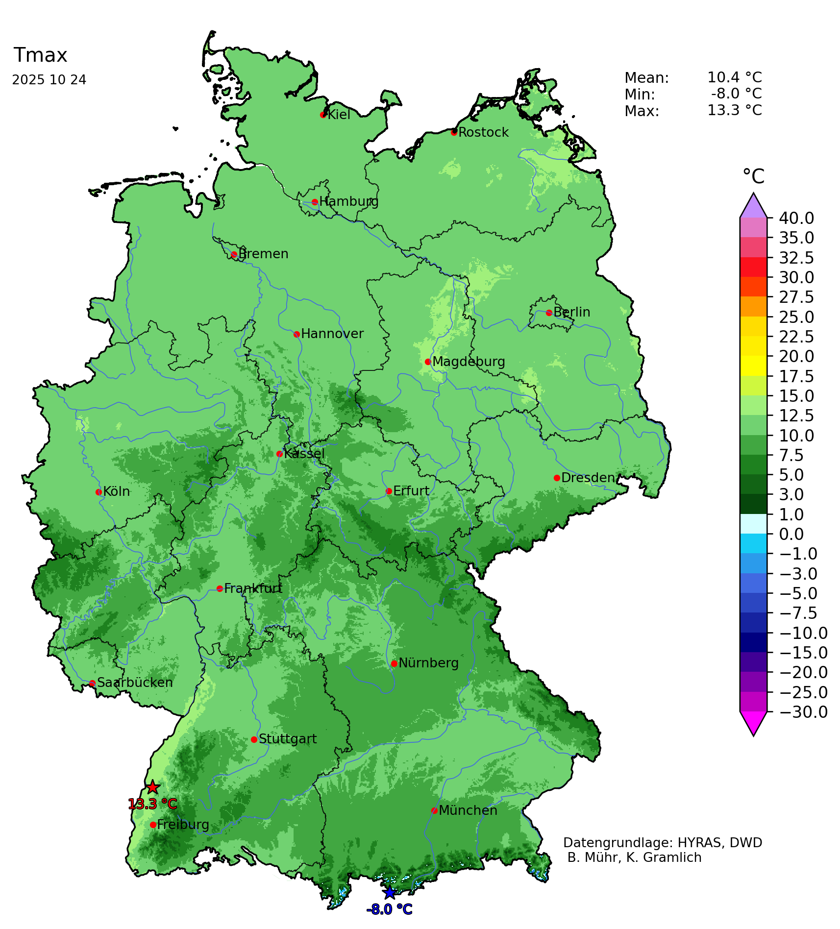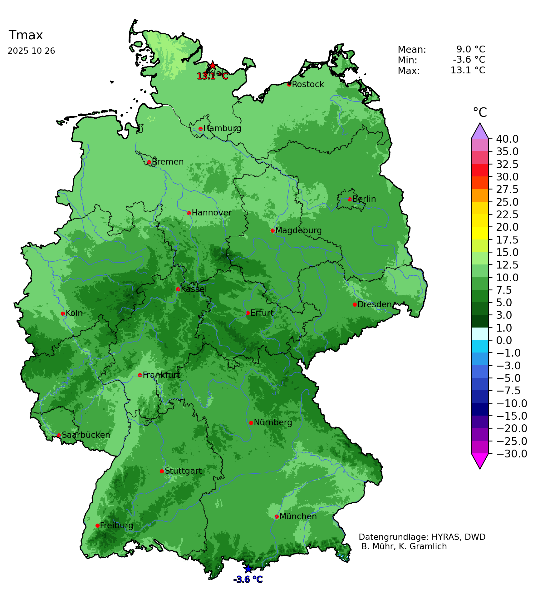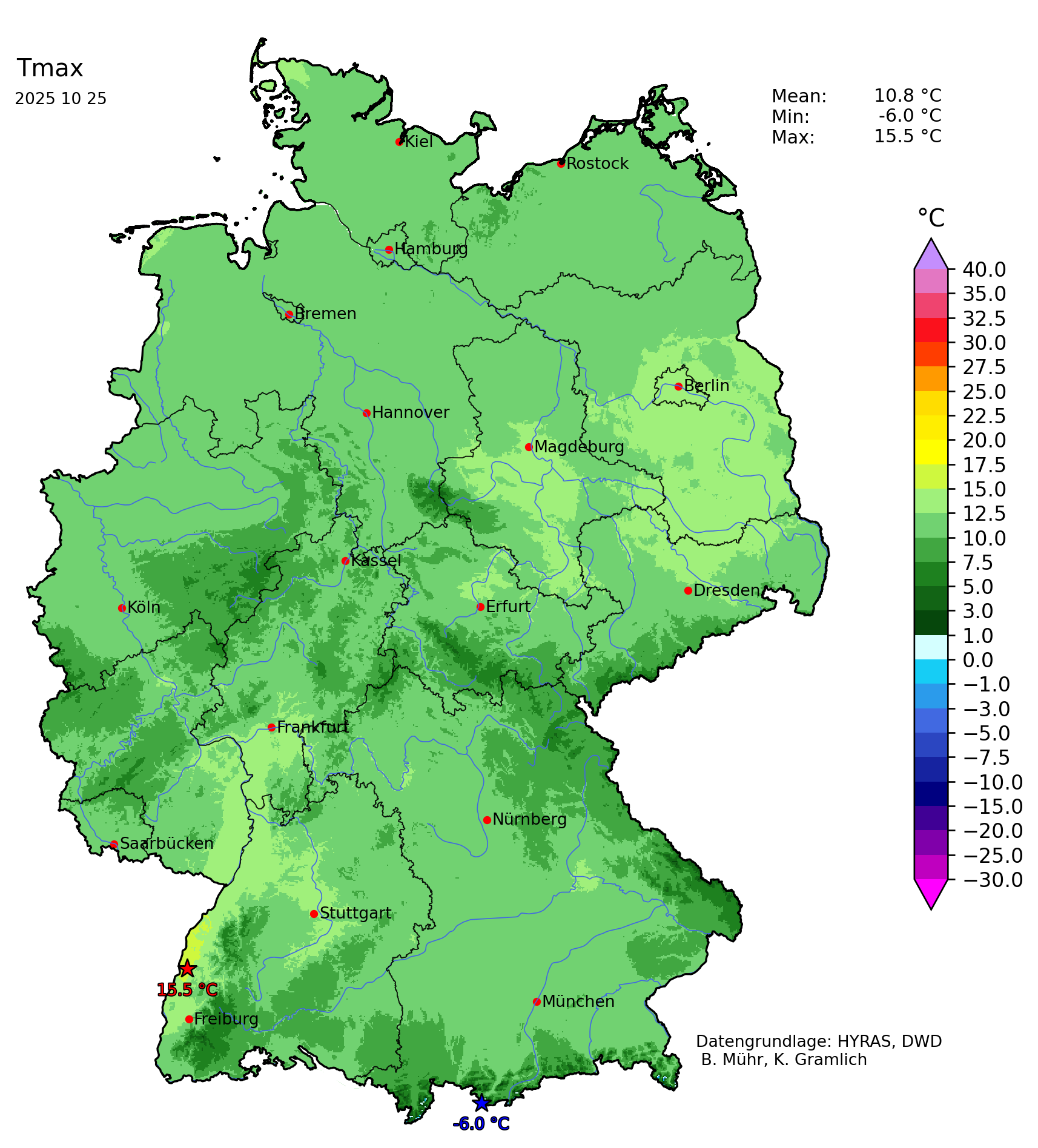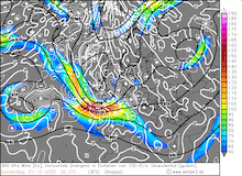 Storm Joshua also brought Central Europe heavy rain. Especially along western-facing mountain flanks, precipitation totals reached more than 100 mm in the Black Forest. Behind Storm Benjamin, very cool air masses for late-October reached Central Europe. 850 hPa temperatures fell to -2 °C. Subsequently, the snow line dropped significantly. In the Alps and the Black Forest, the first snow of the coming winter season accumulated at elevations above 1200 m. In the Alps, local fresh snow accumulations reached up to 20 cm on October 24, 2025. With the tertiary cyclogenesis, an even colder air mass reached Central Europe on October 26, 2025.