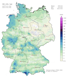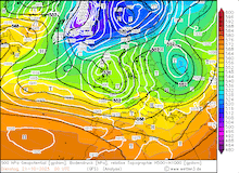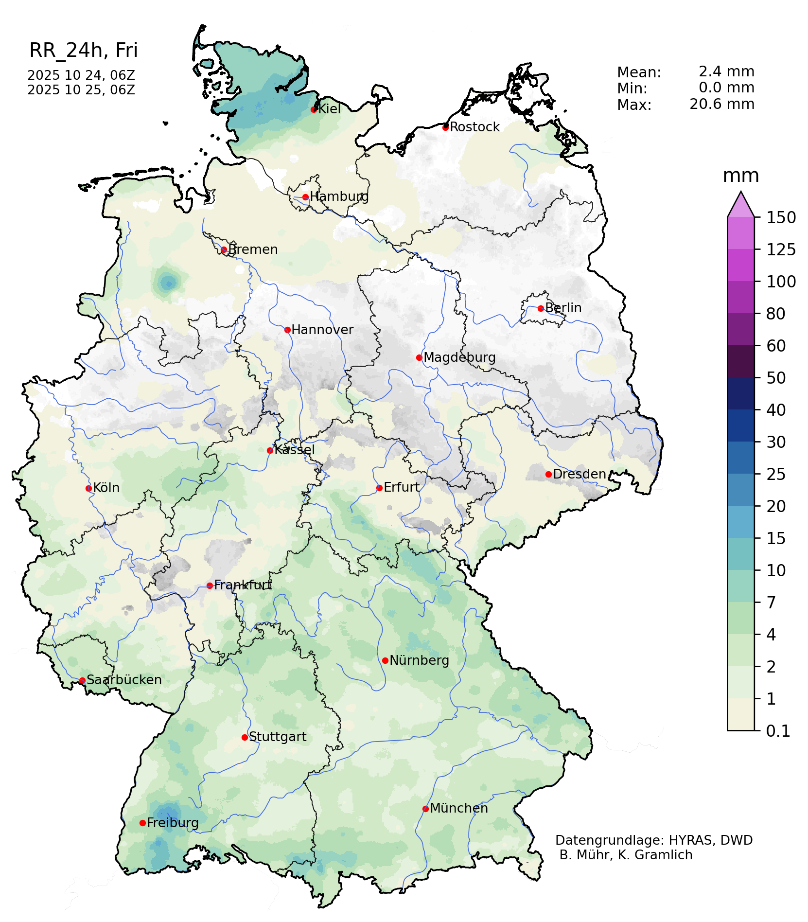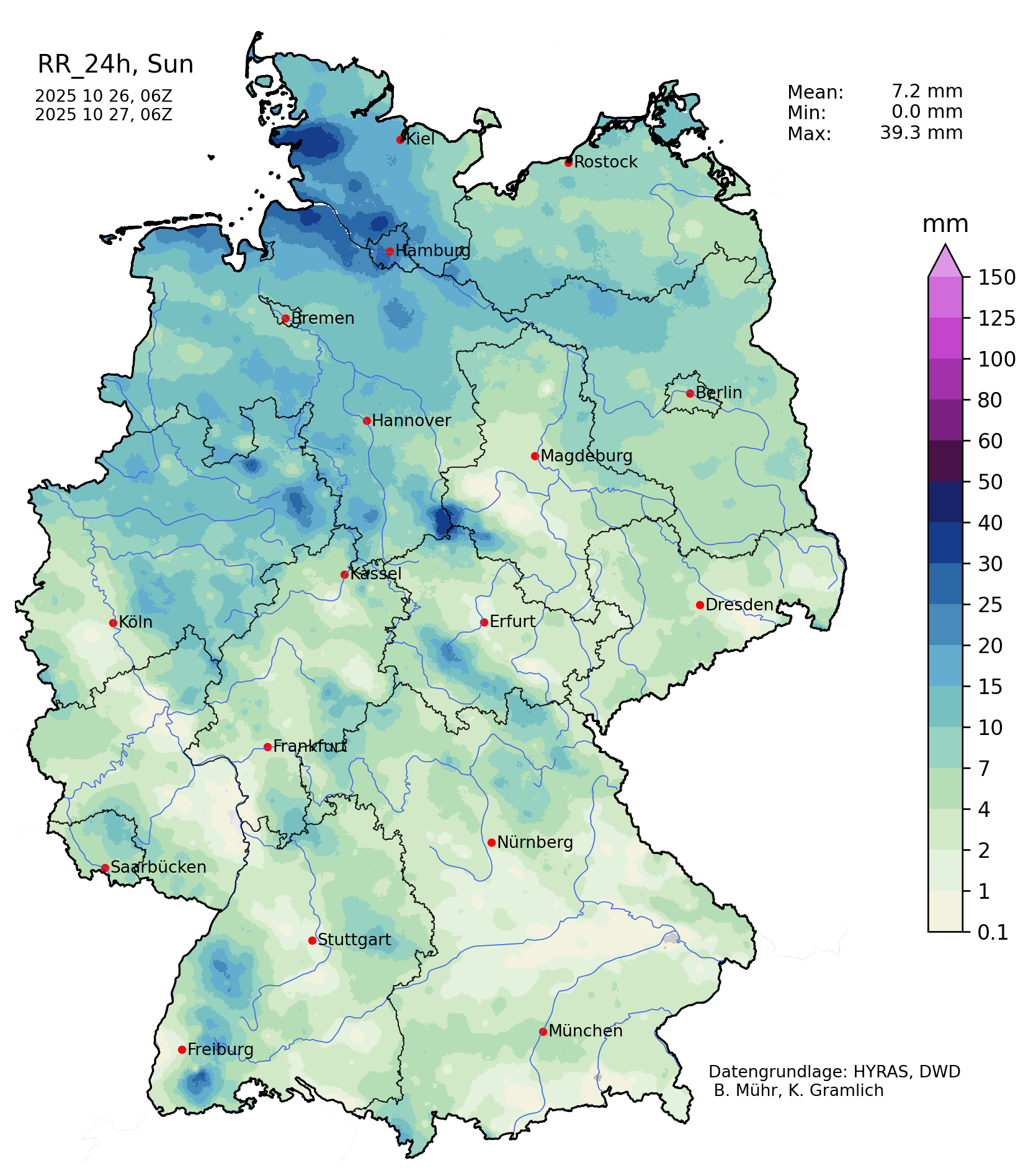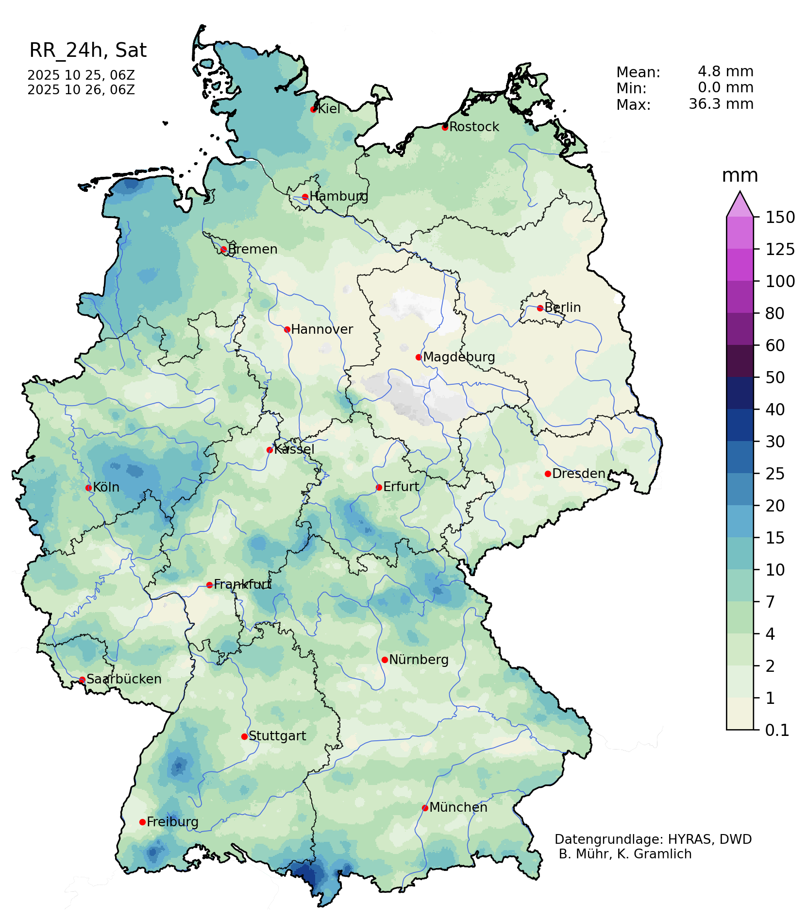Storm Joshua also brought Central Europe heavy rain. Especially along western-facing mountain flanks, precipitation totals reached more than 100 mm in the Black Forest. Behind Storm Benjamin, very cool air masses for late-October reached Central Europe. 850 hPa temperatures fell to -2 °C. Subsequently, the snow line dropped significantly. In the Alps and the Black Forest, the first snow of the coming winter season accumulated at elevations above 1200 m. In the Alps, local fresh snow accumulations reached up to 20 cm on October 24, 2025. With the tertiary cyclogenesis, an even colder air mass reached Central Europe on October 26, 2025.