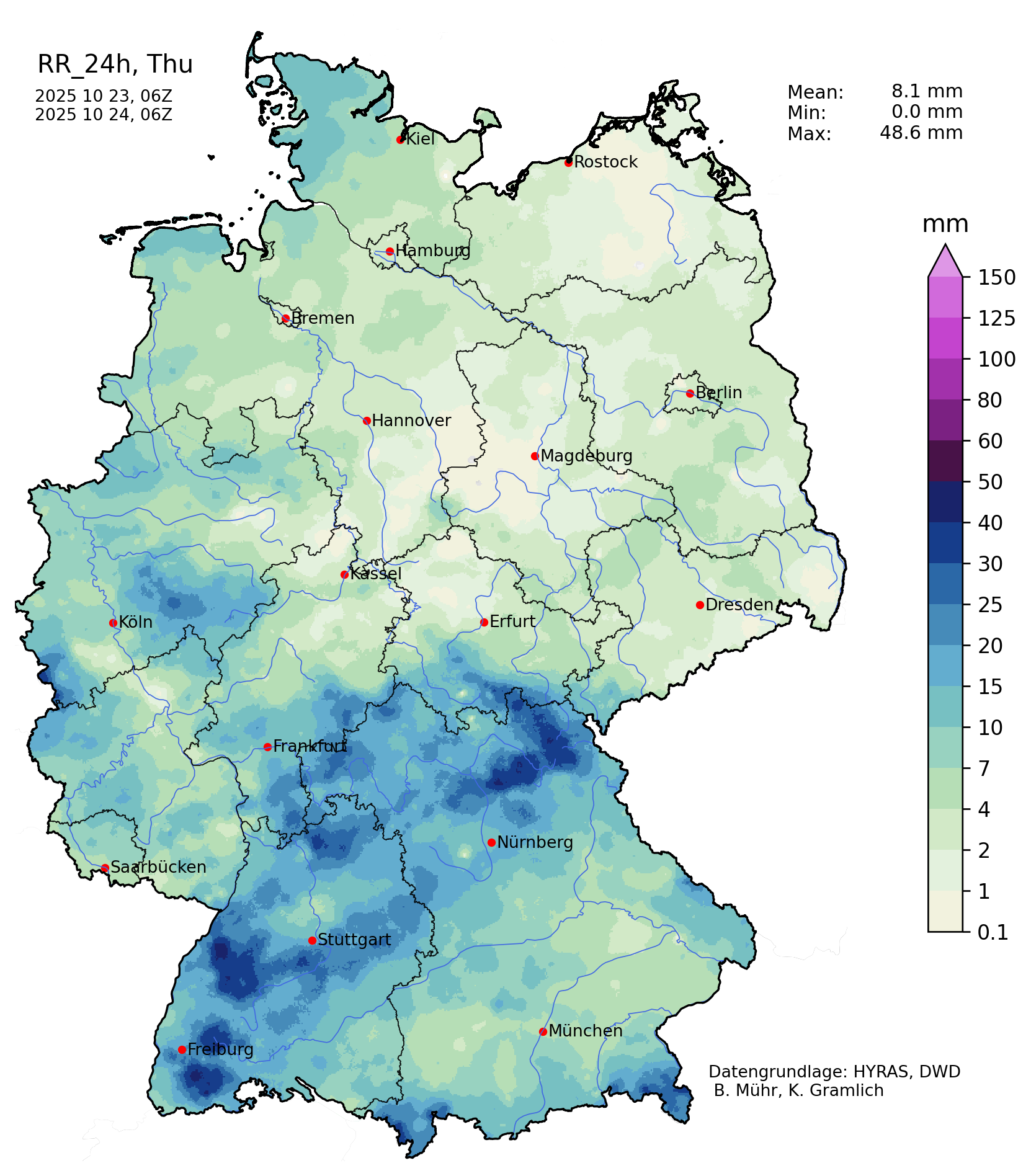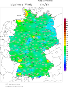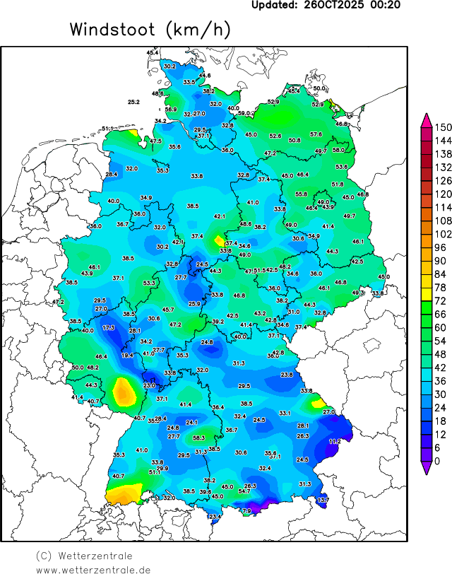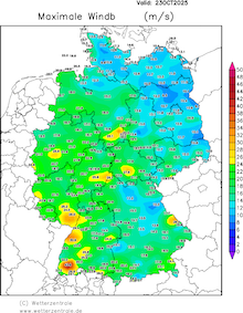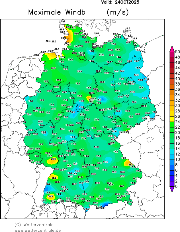 Daily maximum 10 m wind gusts over Germany, 23.10.2025 - 26.10.2025, source: