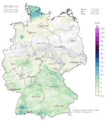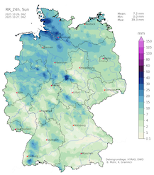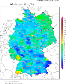 Due to the slow movement of Storm Joshua over the North Sea, high winds impacted Northern Germany for more than 24 h. Wind gusts peaked only in the afternoon hours of October 24, 2025, in far northern Germany. Due to the tertiary cyclogenesis, wind speeds remained above gale force levels until October 26, 2025.