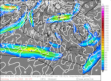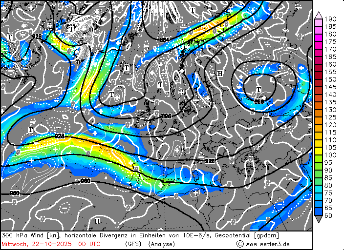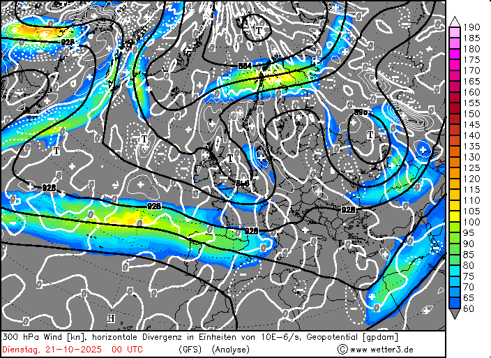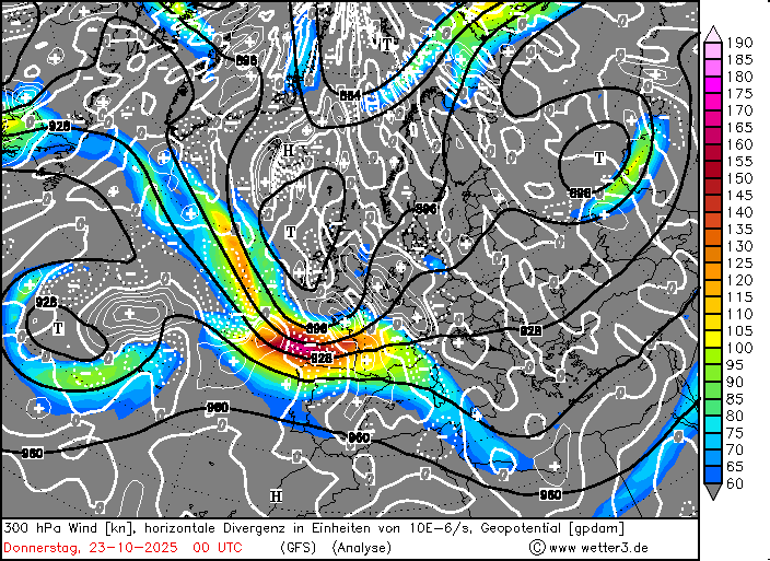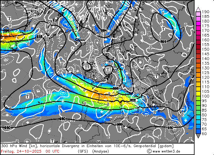 Daily development of the 300 hPa wind and divergence (first row), 500 hPa geopotential, 1000 hPa to 500 hPa thickness, and sea-surface pressure (second row), 850 hPa temperature (third row), and sea-surface pressure and analyzed fronts (fourth row) over Europe, 21.10.2025 00 UTC - 24.10.2025 00y UTC, source: