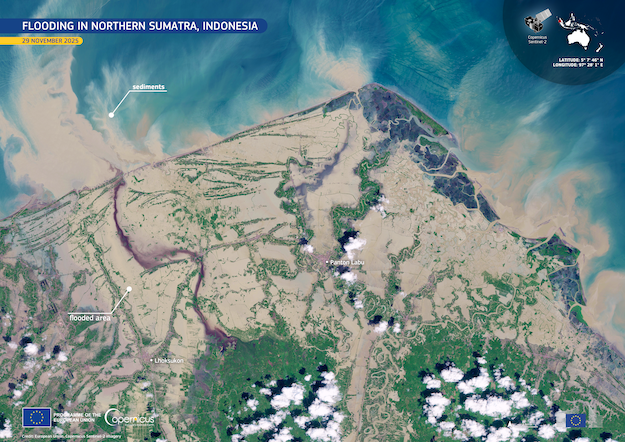 Visible satellite imagery over Northern Sumatra showing the extensive river flooding and drainage after the passage of Cyclonic Storm SENYAR, 29.11.2025, source: