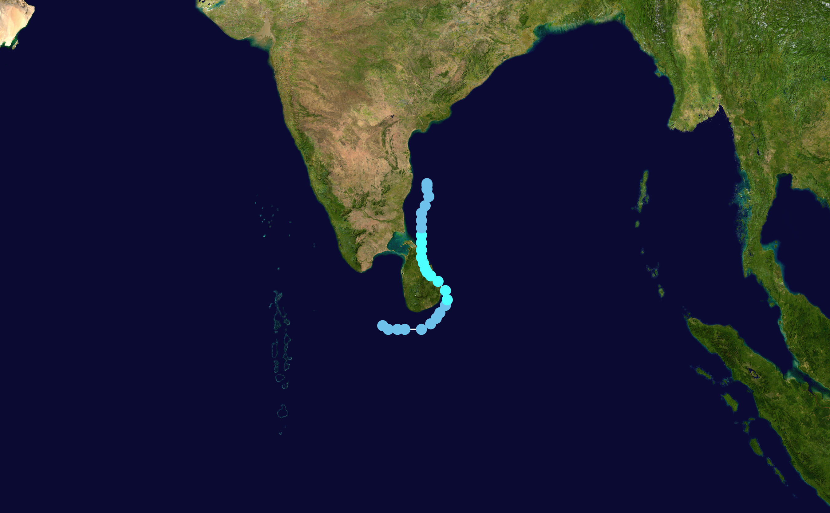 Nearly concurrently with the formation of Cyclonic Storm SENYAR, a second tropical cyclone formed over the North Indian basin. Located just south of Sri Lanka, tropical depression DITWAH formed at a latitude of only 5 °N on November 24, 2025. In the following days, the tropical depression tracked around the island of Sri Lanka. By November 27, 2025, Cyclonic Storm DITWAH made landfall on Sri Lanka. Due to the interactions with the island of Sri Lanka, the circulation center of Cyclonic Storm DITWAH was not always well defined. Subsequently, the official track is wavy and makes the exact landfalling point ill-defined with the current data. Over Sri Lanka, Cyclonic Storm DITWAH reached its peak intensity with sustained winds of 65 kph and a minimum central pressure of 1,002 hPa. In the following days, DITWAH slowly tracked northwards across Sri Lanka.