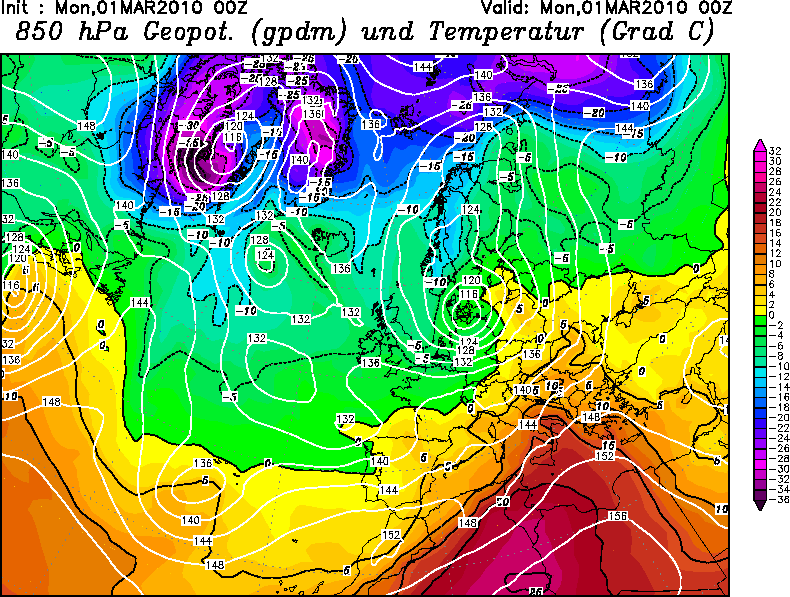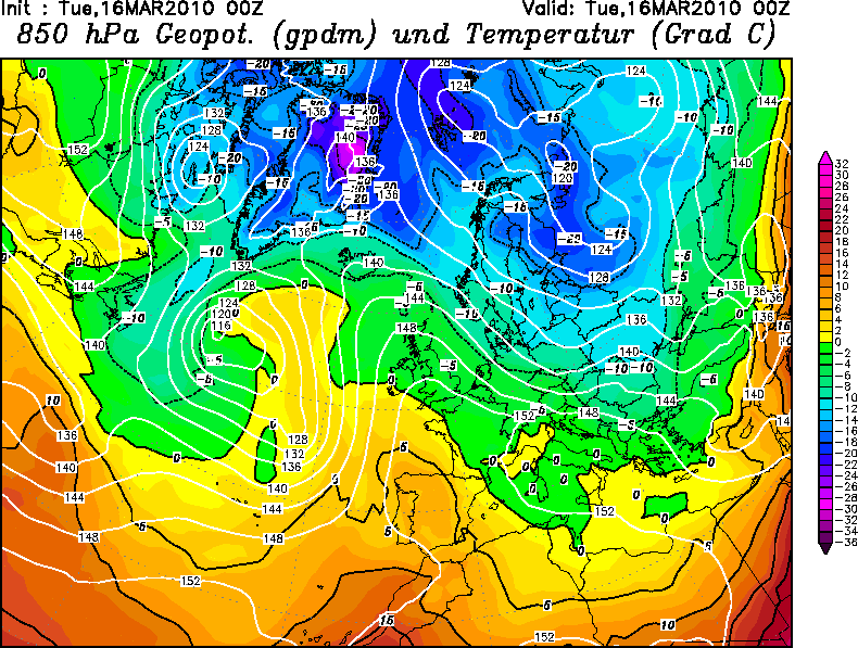 Mit dem Schnee kam die Kälte: Bereits am 6. dominierte Dauerfrost, auf der Rückseite von "Yve" stieß die arktische Kaltluft dann erneut nach Südwesten vor und erfasste im Verlauf selbst Südfrankreich und Nordspanien. Über der frischen Schneedecke und bei weitgehend klarem Himmel sanken die Temperaturen in der Nacht zum 7. im Norden und in der Mitte Deutschlands örtlich bis -20 °C (z. B. Helmstedt-Emmerstadt in Niedersachsen -19,5 °C), vereinzelt wurden neue Rekordtiefstwerte registriert (Leck, Oschatz und in der Nacht zum 8. auch Zinnwald). Derweil verlagerte sich Hoch "Isidor" mit seinem Schwerpunkt zum nördlichen Mitteleuropa, während ein weiteres, kräftiges Tief ("Andrea") von der Iberischen Halbinsel über das westliche Mittelmeer zur Mitte Italiens wanderte. Zwischen der lang gestreckten Hochdruckzone im Norden und dem Tief im Süden wurde mit einer vor allem über dem Süden Deutschlands kräftigen östlichen Strömung der Zustrom arktischer Kaltluft aufrechterhalten. Diese kräftige Ostströmung wurde beispielsweise durch die Spitzenböen auf dem Feldberg im Schwarzwald dokumentiert, wo an vier Tagen hintereinander (6. bis 10.) Werte über 100 km/h gemessen werden konnten. Mehr zu Schneetief "Yve" und der Kälte Anfang März in Mitteleuropa findet sich in einem separaten Artikel.